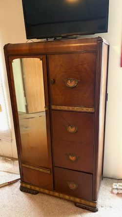 1930's Antique-waterfall wardrobe cabinet showing original inlay and celluloid hardware. Spacious hanging section One small deep cabinet and three de$489Creve Coeur, MO