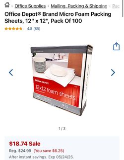 Office Depot® Brand Micro Foam Packing Sheets Moving Supplies , 12" x 12", 2 Pack Of 100 (200)$25Portsmouth, VA