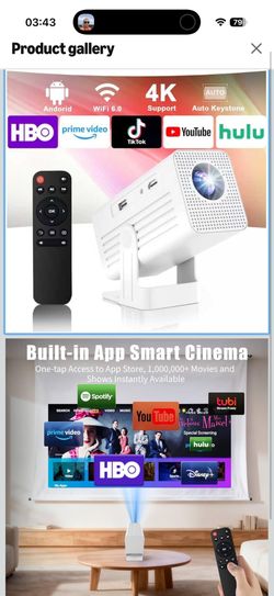 Mini Projector with WiFi and Bluetooth, 1080P Supported Smart Projector with Built in Apps, Outdoor Movie Projector 150" Display, Auto Keystone,Short $50Monterey Park, CA