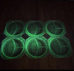 6 Pc Jeannette Glass Green 9 1/4” Divided Plate Uranium Depression Glass Glows!!$175Waynesboro, PA