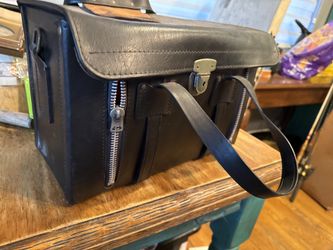 Vintage black leather (or leatherette) camera case with red felt interior and dual heavy zippers. These “doctor-style” cases were common with camera k$250Glendora, CA