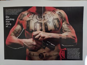 The image is a magazine spread featuring a man with tattoos on his torso and arms, holding a handgun$9Miller Place, NY