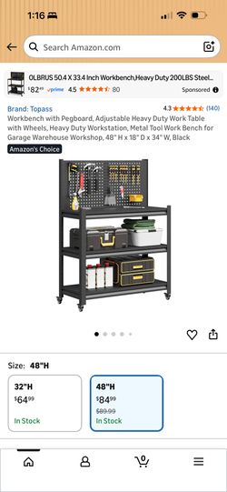 Workbench with Pegboard, Adjustable Heavy Duty Work Table with Wheels, Heavy Duty Workstation, Metal$40Fontana, CA