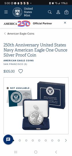 250th Anniversary United States Navy American Eagle One Ounce Silver Proof Coin$200Loma Linda, CA