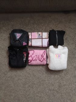 6 For 1-1 Barbie Denim Jacket. 2 Barbie Sweaters, 1 Minnie Mouse Ears Hooded Sweater, 1 Black Zip Up Sweater, And 1 Puma Hooded Sweater Size Youth L$25Rossmoor, CA