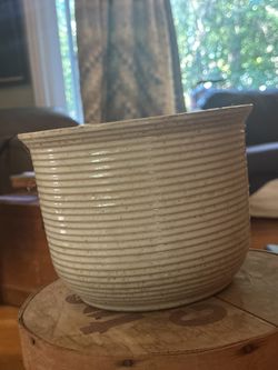 Wheel-thrown stoneware pot with a ribbed texture and natural glaze handmade by a studio potter. $50Grayslake, IL
