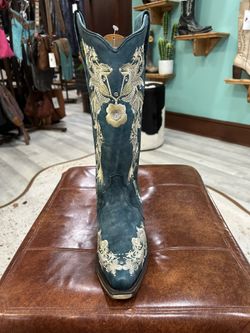 WOMEN'S WHITE FLORAL EMBROIDERY WITH CRYSTALS NAVY BLUE SNIP TOE COWBOY BOOT$269Rowlett, TX