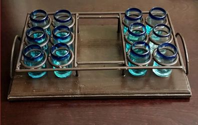 Mexican Hand Blown Cobalt Blue Tequila Shot Set Of 12 Glasses with Carrier Caddy$60Laredo, TX