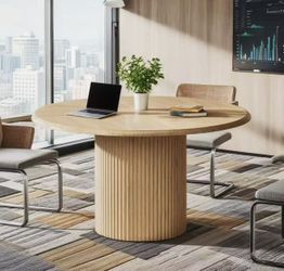 XK00817 47" Round Conference Table for 4, Farmhouse Wooden Meeting Room Table with Sturdy Fluted Metal Base, Modern Office Training Desk for Office, C$100La Mirada, CA