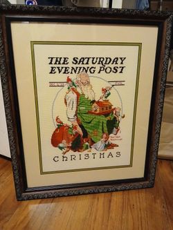 Norman Rockwell, Saturday Evening Post, framed cross- stitch, Santa 22.5"x19", wood & glass frame$75Irving, TX