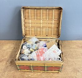 Bamboo Sewing Basket Filled With Thread, Buttons, and Other Sewing Notions$30Seatac, WA