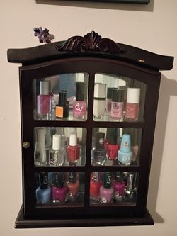 “Wall-Mounted Wooden Nail Polish Display Cabinet with Glass Door – Includes Assorted Nail Polish Lot”$70Bear Grass, NC