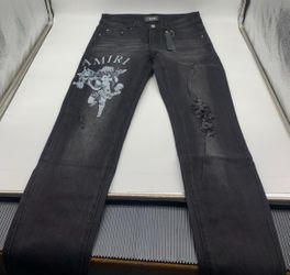 AMIRI Black Distressed Jeans with Angel Graphic – Men’s Designer Denim$350Hartford, CT