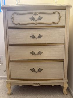 Great condition. This mid century French provincial style Highboy dresser features pressed wood construction, four dovetailed drawers, white lacquer $35West Los Angeles, CA