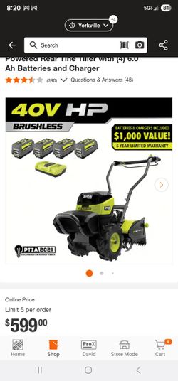 40V HP Brushless 18 in. Battery Powered Rear Tine Tiller with (4) 6.0 Ah Batteries and Charger$500Aurora, IL
