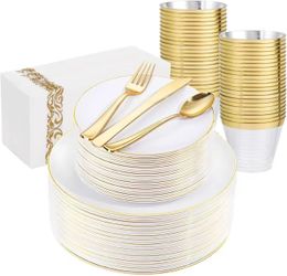 D15# OCCASIONS Set & 100 Guest Wedding Disposable Plastic Plate & Silverware Combo Set (White & Gold Rim plates, Gold Silverware)$65Rosemead, CA