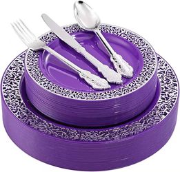 D16# 150PCS Purple Silver Plastic Plates with Silver Silverware, Silver Party Supplies for 30 Guests Include 30 10.25" and 30 7.5" Plates, 30 Forks, 3$22Rosemead, CA