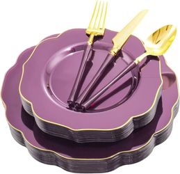 D17# Clear Purple Plastic Plates - Purple Party Disposable Gold Plastic Plates including 48Plates, 24Forks, 24Spoons, 24Knives for Party & Wedding & H$22Rosemead, CA