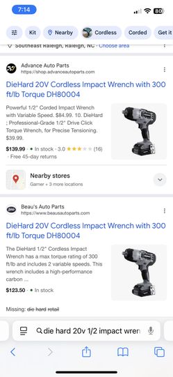 DieHard 20V 1/2” Cordless Impact Driver – Powerful, Reliable, Includes Battery & Charger$75Raleigh, NC