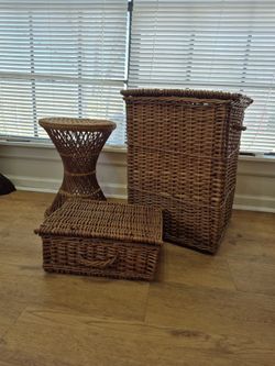 ​Vintage 70s Boho Rattan Bundle | Hourglass Spool Stand, Large Utility Hamper & Woven Trunk | Organic Modern Decor Set$250Baton Rouge, LA