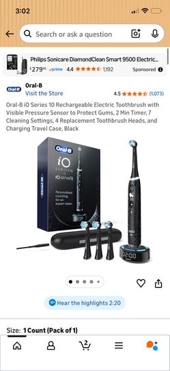 Oral-B iO Series 10 Rechargeable Electric Toothbrush with Visible Pressure Sensor to Protect Gums, 2 Min Timer, 7 Cleaning Settings, 4 Replacement Too$285Bakersfield, CA