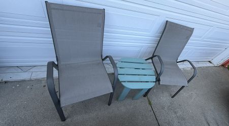 Outdoor Patio Set of 2 grey sling chairs with black metal frames and a turquoise blue slatted side table$70Berkeley, CA