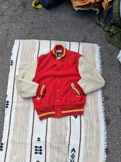 vintage Holloway varsity jacket with red wool body and white leather sleeves. $45San Marcos, CA