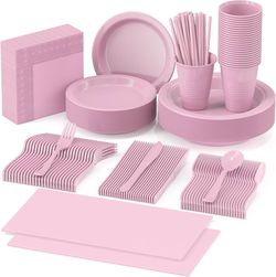 Plastic Plates Set, 25 Guest Party Supplies Set, Disposable Dinnerware Set, Including Plastic Plates, 12 oz Cups, Green, Lavender, Pink Blue Gold, Et$10Chino Hills, CA