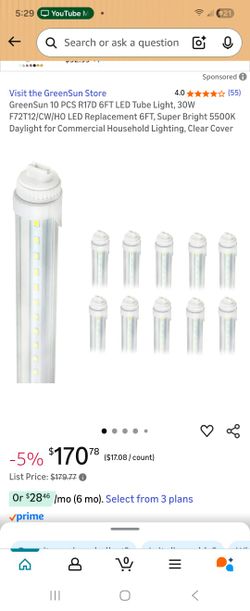 LED Tube Light GreenSun 10 PCS R17D 6FT LED Tube Light, 30W F72T12/CW/HO LED 6FT, Super Bright 5500K Daylight$40Philadelphia, PA