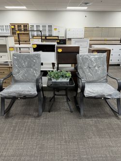 3-Piece Outdoor Patio Bistro Set Black Metal Rocking Chairs and Table with Gray Cushions. 💰110$$110Buford, GA