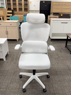 Modern ergonomic office chair in white, featuring a breathable mesh back with built-in lumbar support, adjustable 3D headrest, flip-up rotating armres$70Buford, GA