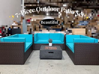 7-Piece Outdoor Patio Sectional Set – Dark Brown PE Wicker Sofa with Cushions ➕ Fire Pit Table, Perfect for Backyard, Garden, or Poolside Gatherings. $399Buford, GA