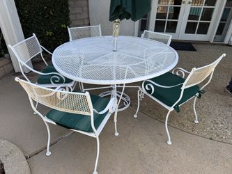 Vintage White Wrought Iron Mesh Outdoor Table And Chairs. Umbrella included. $300Los Angeles, CA