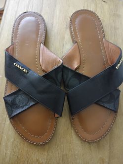 Coach Women's Leather Slide Sandals Black and Brown Criss-Cross Logo Strap$18Houston, TX