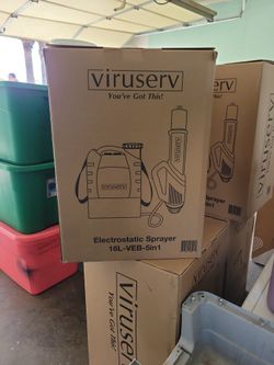 The object in the image is a Viruserv 16L-VEB-5in1 backpack electrostatic sprayer. This device is used to efficiently apply disinfectant solutions to $300Pomona, CA