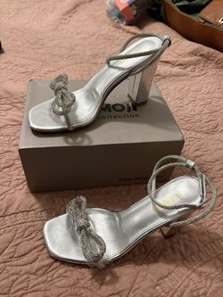 AMOJI Silver Rhinestone Bow Heels – Women’s Size 37 (US 6–6.5) Dress Sandals$30Houston, TX