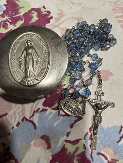vintage blue bead rosary with a Miraculous Medal centerpiece and a crucifix, often found in a matching case.$35Escondido, CA