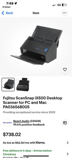 Fujitsu ScanSnap iX500 Desktop Scanner for PC and Mac PA03656B305$69Berkeley, CA