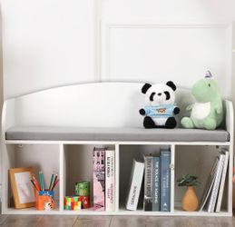 Kids Bookshelf with Reading Nook, Toddler Bookshelf with Soft Grey Cushion, 4-Cube, White,(MOMC-KB-T)$85Menifee, CA