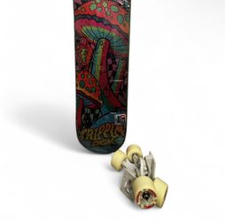 Trippy mushroom skateboard deck with yellow wheels and bearings$200Richmond, CA
