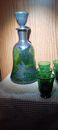 vintage green glass 10pc decanter set with a silver overlay design$100Herald, CA