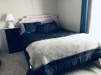 Queen bed,headboard,bedding and frame$550Huron Charter Township, MI