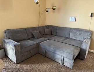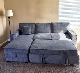 Grey Corduroy Sectional with a Pull-out Sleeper and Storage Chaise$450Temecula, CA