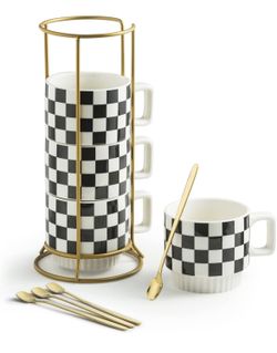 Stackable Coffee Mug Set of 4 with Rack 11 oz Tea Cup Set with Little Spoon for Coffee Tea Cocoa Milk, Checkered Black and White Pattern Coffee Mug fo$25Tomball, TX