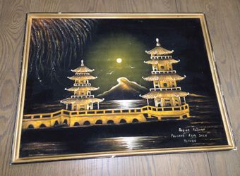framed scratchboard art piece, likely a souvenir depicting the Spring and Autumn Pavilions in Kaohsiung, Taiwan.$80Fresno, CA