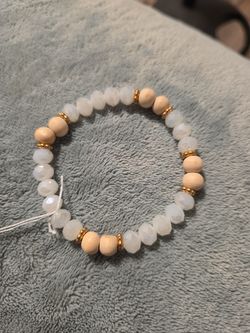 Beaded Wood and Glass Stretch Bracelet White Gold Beige Unisex Round$8Spokane, WA