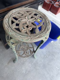 ornate cast iron garden plant stand with a verdigris finish and a removable floral-patterned center$100Las Vegas, NV