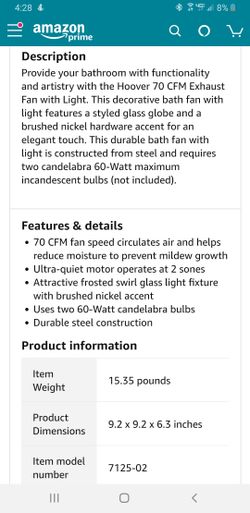 Hoover 7125-02 2 Sones 70 CFM Decorative Bath Exhaust Fan with Light, Glass Globe$44Wellington, FL