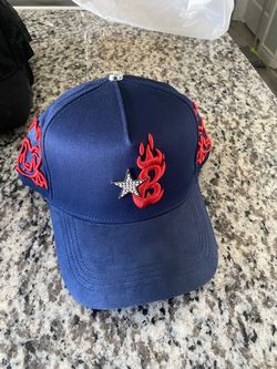 Blue Suede Snapback with Red Flame Embroidery & Rhinestone Star$55Bakersfield, CA