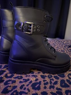 Black faux leather zip up boots with buckle detail$10Orlando, FL